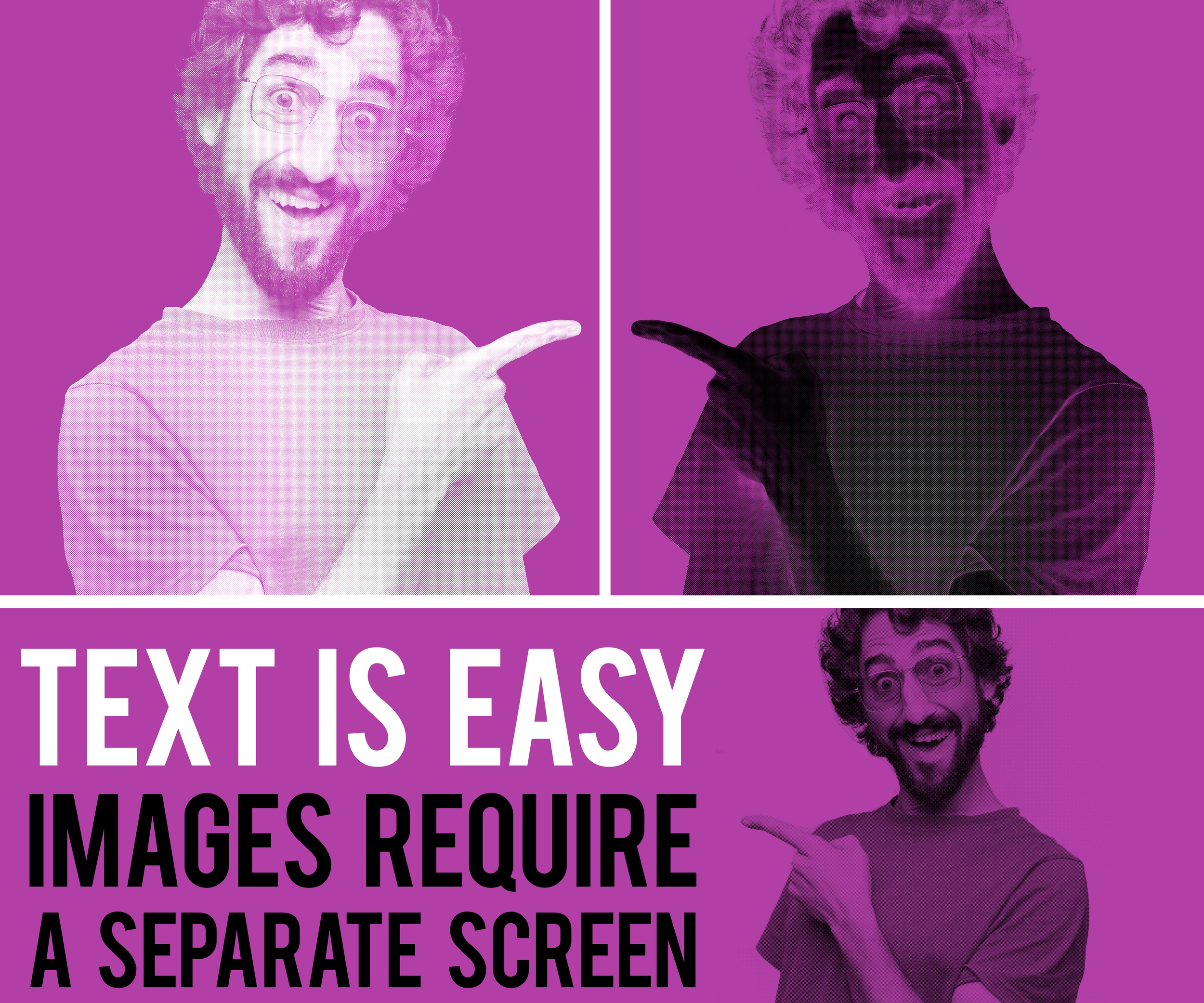 Screen printing is pretty versatile but not every image will translate into a cohesive image if you do not follow basic art guidelines for screen printing. Here are a few reasons why we wouldn’t recommend trying to print your amazing fairy unicorn design.