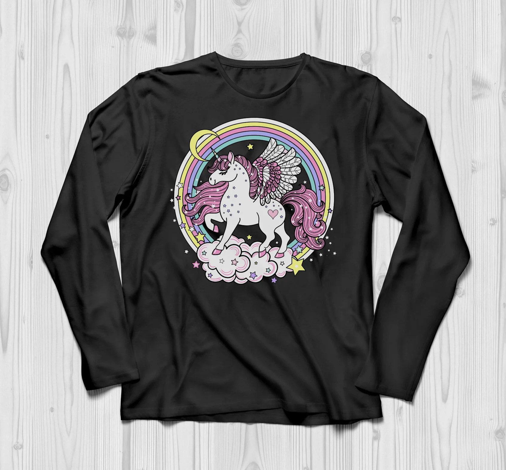 Consider re-thinking your original idea… Is there another way to create a colorful fairy rainbow unicorn that might work better for screen printing? I think so! The example image below only utilizes 5 colors (5 screens) and fits on the shirt nicely. This doesn’t seem like a compromise at all, in fact it might even be an improvement!